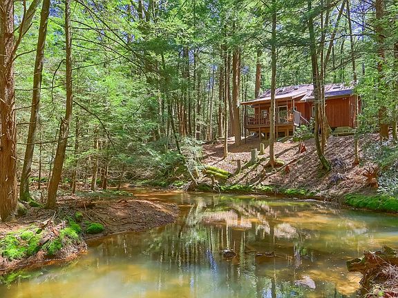 "Rare find" nestled amongst the trees overlooking Licking Creek is an "Off the Grid" cabin. Features on the first floor include a full bath with new fixtures and a claw foot tub, a large oak kitchen with a butcher block countertop, off the kitchen is the main bedroom. Through the sliding glass doors you will find a covered front porch overlooking the water. The living room is equipped with a wood burner, new furnishings and a large picture window to view the wild life. There are plenty of places to sleeps as there is a bedroom upstairs from the living room and a sleeping loft off of the kitchen. The cabin can comfortably sleep 8. The property has been recently surveyed and consists of 5.91 wooded acres which borders Licking Creek and the No maintenance road. With a flip of a switch the propane Kohler generator turns on and powers the entire cabin. It's located within another outside building so you can barely hear the sound. Minutes from Cook Forest and the Clarion River.