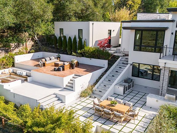 Completed in 2019, this custom-built Los Altos estate combines timeless architecture with modern sophistication, designed by prestigious architect Gary Kohlsaat, and overlooks the golf course. The home features five private bedroom suites including one showcased as an executive office and a fully furnished state of the art home theatre with high end projector, 120 inch screen, and 7.1 surround sound. Expansive La Cantina glass doors, soaring ceilings, and skylights fill the open layout with natural light. The living and family rooms feature integrated 5.1 surround sound systems. The chefs kitchen offers a large island, quartz countertops, and premium appliances. Smart home technology includes multi zone climate control, automated blinds, and an app controlled Sonos sound system extending indoors and outdoors. A whole house water softener system enhances comfort. The resort style backyard offers a full outdoor kitchen with pizza oven, BBQ, and burner, a twelve seat fire pit, jacuzzi, putting green, and lush landscaping. Additional highlights include wide plank hardwood floors, designer lighting, and a three car garage with EV hookup. Ideally located near downtown Los Altos, the Country Club, and top rated schools.