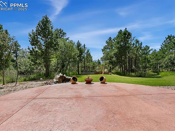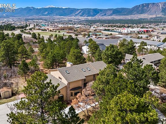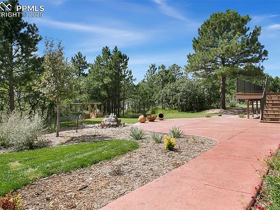 The Pikes Peak and front range views from this Woodmoor home are spectacular! Almost 1 acre on a quiet cul de sac. Move in ready. Everything about this home has been meticulously cared for by the owners and it shines. Stucco and stone exterior. Extensive interior and exterior upgrades completed in the past few years. Check out the views from the primary suite! Just a few of the amazing features include a double-sided fireplace, soaring ceilings, hardwood and tile floors, plenty of natural light, recently upgraded kitchen, quartzite and engineered stone counters, maple cabinets, a cute kitchen bench with seating by a picture window, double stainless-steel ovens and more! There is a main level bedroom with hardwood flooring, picture window and a 3/4 bath located next to it. The primary bath includes a jetted tub, 5-piece bath and a walk-in California closet. The two upper guest bedrooms share a jack and jill bathroom with a shower. The basement includes a wet bar with beer tap, pool table, pool sticks, pool stick mount, gas fireplace, speakers and a mounted television. Newer carpeting has been added. Central air was added in 2023. The main level laundry room features cabinets, built in ironing board and washer/dryer included. The 3-car garage includes a workshop/workbench and storage shelves. The backyard has a storage shed and fenced protected garden perfect for plants and vegetables. Plenty of storage space including a crawl space in the basement. Circular driveway in front of the home with additional parking spaces for guests. Relax on the huge newer composite deck with a retractable awning and listen to the bubbling fountain along with the sound of the breezes thru the pine trees. Easy access to local trails, shopping, restaurants and easy access to I-25 for a commute to Denver or Colorado Springs. This home really does have it all. Welcome home!!