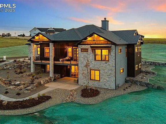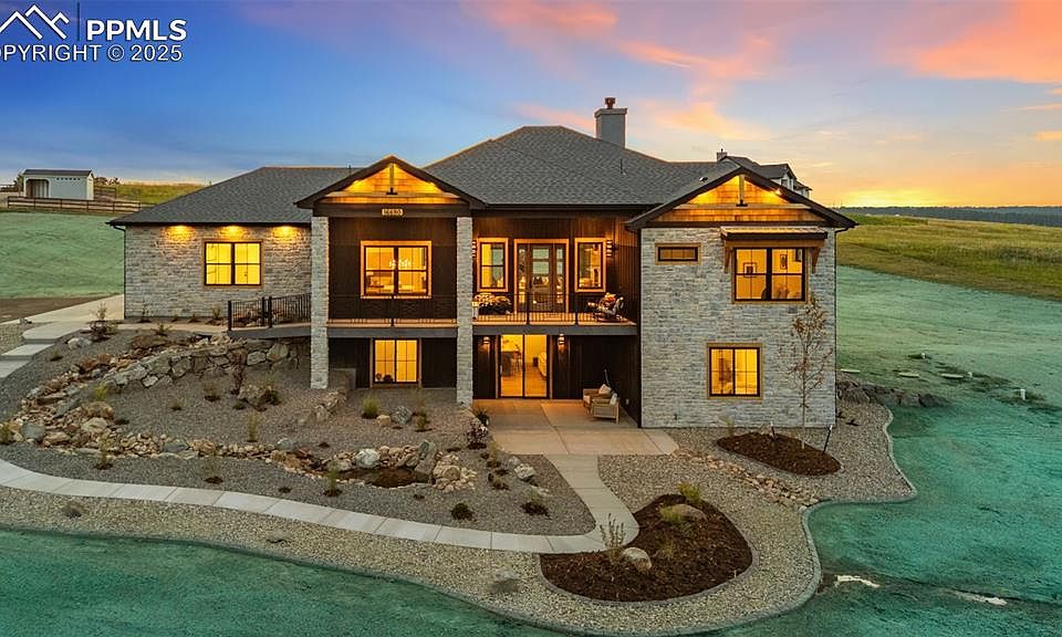 Nestled on a spacious homesite in the picturesque Winsome community, this 2025 Parade Home built by JS Luxury Homes blends refined design, timeless craftsmanship, and modern livability. The stately exterior of stone, wood, and rich architectural detail sets the tone for the luxurious interior within. Expansive windows capture sweeping views of Colorado’s landscape, while the soft glow of evening light enhances the home’s warm, inviting presence. Inside, every detail is thoughtfully curated. The open-concept great room features soaring ceilings with exposed beams, a stunning stacked-stone fireplace, and wide-plank flooring throughout. Oversized glass doors connect the living space to a covered patio with a double-sided fireplace and stone fire pit, creating the perfect setting for indoor-outdoor living. The chef’s kitchen is elegant and functional, highlighted by natural wood cabinetry, a large quartz island, full tile backsplash, and stainless appliances including a gas range and double ovens. Pendant lighting and a built-in workspace make this kitchen the heart of the home. The dining area with wood-slat accent wall offers an intimate setting framed by designer lighting and large picture windows. The primary suite is a true retreat with mountain views, a stone fireplace, and a spa-like bath featuring custom cabinetry, dual vanities, and a glass-enclosed shower. The finished lower level includes a wet bar, rec room, home gym, and guest suites. Outdoors, enjoy year-round living by the covered patio fireplace or fire pit while taking in stunning sunsets.