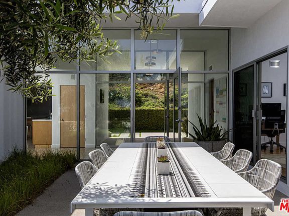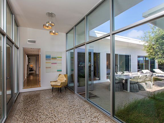 Perched above the Pacific Ocean in the coveted Pacific Palisades with views of the Queen's Necklace, this sublime single-story, 6-bedroom 1965 mid-century modern home, redesigned by renowned architect John Bertram (known for his thoughtful and inspired restoration of 5 homes by modernist master Richard Neutra), boasts an abundance of natural light, sliding walls of glass, a strong indoors - outdoors connection, and a flexible and open floor plan. The gourmet kitchen (with its center island, custom cabinets and pro appliances) opens to the family room. Terrazzo floors, mosaic glass tiles, and CaesarStone countertops are but some of the designer finishes. Newer solar-heated pool and spa. Two sizable grassy areas and a gated, private drive. Within the highly sought-after Marquez Charter Elementary, Paul Revere Charter Middle and Palisades Charter High School districts. Updated for today, yet appealing to those who yearn for a connection to yesteryear. This is functional art at its best.