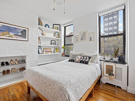 The inviting bright living area has two custom built-in wall cabinets with shelves and two large windows with eastern exposure. The cozy bedroom with exposed brick has two large windows and a custom walk-in closet with shelves and hooks. Additionally, there is a separate floor-to-ceiling built-in shelving unit and even more shelves along the wall. Ceiling fans in both the living area and bedroom allows for cooling and circulation.