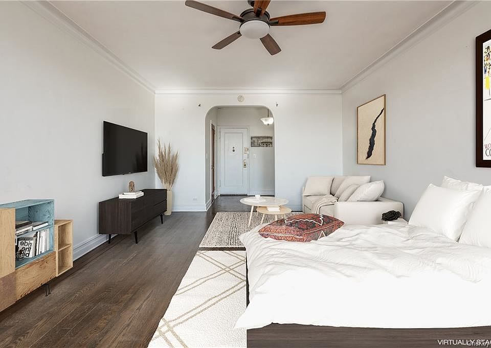 Large, bright and sunny 5th floor studio apartment with gorgeous views of Long Island Sound. The Colonial House is a superb pre-war building located in downtown New Rochelle. Living space offers beautiful high ceilings, crown molding and hardwood floors throughout. Updated eat-in kitchen with stainless steel appliances, subway backsplash and granite countertops. Entry foyer has enough space for a home office area. Common laundry in basement. Just a few blocks from Metro North train station, shops and restaurants. Municipal parking lot across the street from Church.
