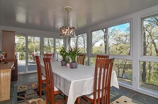 Designed to take advantage of the stunning views of the Charles River, and the tranquility of this special setting for all four seasons! Wonderful Cape style home remodeled in 2008, and then totally updated in 2017. Walls of glass provide an abundance of natural light throughout this well thought out open floor plan. Expansive great room with cathedral ceiling and fireplace providing access to the stone patio and spectacular koi water garden! Fabulous eat in kitchen opening to dining room also surrounded by glass overlooking the river. Custom designed half bath with onyx sink and onyx countertop with special under counter lighting. First floor master bedroom with spa like full bath and walk in closet. This home also features two additional bedrooms on the second level, one with large deck, plus two full baths. Three full baths feature radiant heat. Lower level provides bonus/music room, full bath, storage. Five bdrm septic. Enjoy your own private retreat with 210' on the Charles River!