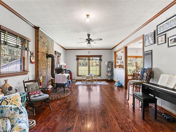 This scenic riverside property on just under an acre showcases a wide front porch, a large in-ground freshwater POOL with WATERSLIDE, a large poured concrete deck, a MASSIVE COVERED PATIO area, and a HUGE 1600 sqft detached GARAGE and WORKSHOP (plumbed for a full bath). Huge, OPEN CONCEPT LIVING AREA has separate formal living room, den, dining area, and large chef's kitchen with updated stainless steel appliances, granite countertops, and walk-in pantry.