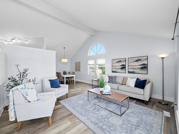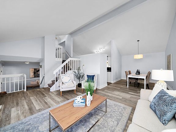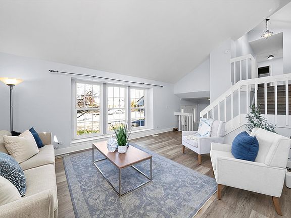 Luxury living on a quiet cul-de-sac with vaulted ceilings, designer updates, and an entertainer's dream basement! Features include mocha hardwood floors, dramatic vaulted living/dining areas, and a bright kitchen with granite counters, SS appliances, white cabinetry, and pantry. Family room offers, a gas-start brick fireplace, and access to a two-tiered deck overlooking a serene, tree-lined backyard. The vaulted primary suite boasts a spa-like bath with soaking tub, dual vanities, separate shower, and WIC. Finished basement includes media area with projector/screen & surround sound, office, and flexible rec/storage space. Major updates: (2025) vinyl flooring in family room, dining room, living room, stairwell and hallway, roof (2022) sump pump (2020), furnace & deck (2019), smart Ecobee thermostat. Walk to park, pond, school, and shopping!
