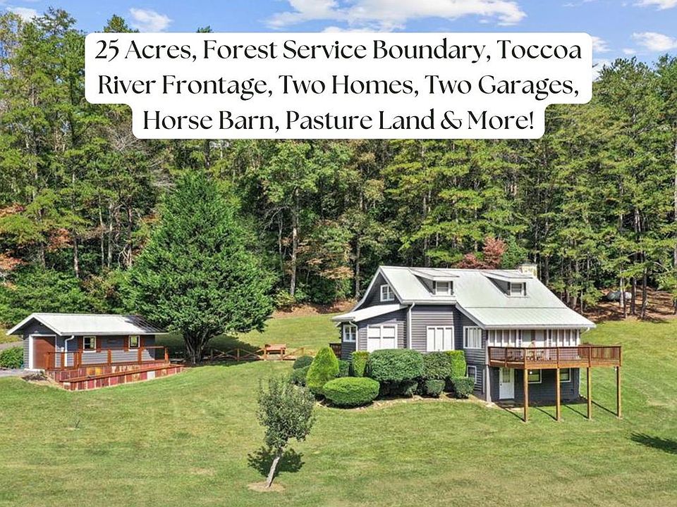 Toccoa River Hidden Cove 25 Acre Mountain Retreat! Escape the city to your own private sanctuary bordering the Chattahoochee National Forest with around 400 feet of pristine Toccoa River frontage. This rare estate offers multiple residences, including a beautifully renovated 3BR/2BA main home featuring custom wood detailing, river stone fireplace, all glass sunroom, and a full length deck with sweeping mountain views. Recent upgrades include a dramatic kitchen makeover with custom cabinetry, Dekton countertops, and brick flooring, plus updated baths and a serene primary suite with sitting area. The historic 2BR/1BA “home place” cabin features a cozy fireplace, spacious living room, and covered porch overlooking a spring branch. A separate 1BR guest apartment with full bath includes a large patio and is attached to an oversized dual bay workshop. Enjoy sitting at your private pavilion overlooking the roaring Toccoa River and the National Forest across the river. Catch beautiful brown + rainbow trout, float, and make memories. A phenomenal, cleared homesite on the Toccoa River is apart of this magnificent estate. Equestrian amenities include a 6 stall horse barn with paddocks and a secondary entrance for easy trailer access. A covered pavilion overlooking the river is ideal for entertaining. Multiple garages, storage, and workshop spaces provide endless utility. Wildlife abounds..deer, turkey, and the occasional black bear roam freely..while fishing, hiking, riding, and hunting opportunities are just steps away in 800,000+ acres of National Forest. Located 25 minutes from Blairsville and 45 minutes from Ellijay or Dahlonega, you'll enjoy easy access to orchards, vineyards, whitewater rafting, and scenic drives through the Appalachian Mountains. All within 2 hours of Atlanta or Chattanooga. Proof of funds or pre-qualification letter required to schedule a showing; earnest money of at least 1% of purchase price expected.