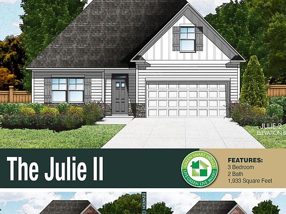 The Julie II is well curated floor plan that invites you to come in from the moment you drive up and see the tasteful brick front and covered entry that says "Welcome Home"! The kitchen includes staggered shaker cabinetry, a beautiful farmhouse sink, gas stove, pendant lights, designer granite countertops, stainless steel appliances, upgraded plumbing, and an island. The kitchen opens up to the great room which includes a fireplace, and dining area. The great room is the perfect space for both everyday living entertaining family and friends and has an abundance of natural light. The spacious primary suite includes dual sinks with granite vanity tops, garden tub, shower, enclosed water closest, and a massive closet. Upstairs is the 4th BR that can also be a flex room. Home also includes Craftsman brushed nickel light fixtures, extensive closet space throughout, and an irrigation system. Interested in a Green Smart home? Live Green. Live Smart. The tankless hot water heater, programable thermostat, Energy Star appliances, Low-E glass windows, above industry rated insulation, and a programmable 4-Zone irrigation system are just a few of the standard items that will assist with lowering your monthly utilities while reducing your carbon footprint at the same time. Relax and unwind on the covered patio, an ideal place to enjoy the beauty and nature of the spacious backyard. Each lot is unique and provides plenty of green space overlooking wooded views, perfect for entertaining guests and creating memories for many years to come.
