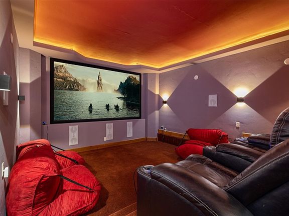 Transform your evenings with a true cinematic escape right at home. This custom-designed private theater features tiered leather recliners, ambient LED ceiling lighting, acoustic wall treatments, and a full surround sound speaker system for a premium movie-watching experience. Whether you're streaming the latest release or hosting a game-day gathering, this Breckenridge home theater offers a cozy, high-end entertainment space ideal for second-home relaxation or short-term rental appeal. A rare luxury in mountain properties, it adds value and lifestyle all in one. Life is good here.