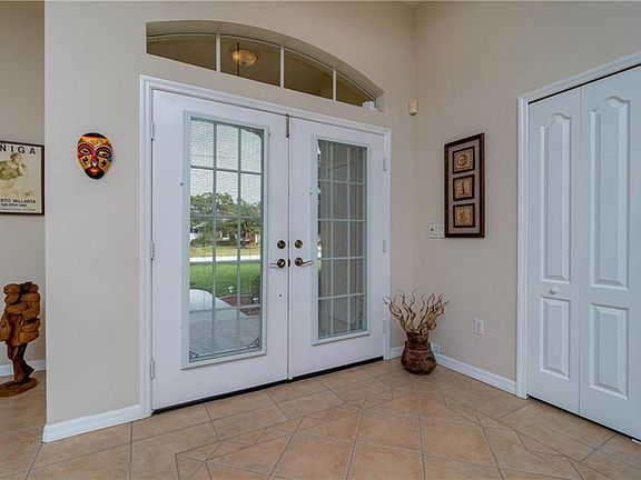 If you were to ask an artist to paint the perfect setting for an elegant home, this would be the masterpiece.This tropically landscaped 3BD/2BA/2CG CANALFRONT home has everything a buyer would want plus more.The double door entrance creates anticipation as to what awaits inside.The Foyer welcomes all your guests w/it's custom tiled flooring plus coat closet.The main living area features large windows, pocket 8' tall sliding glass doors, tiled flooring throughout & custom accents which all work together to create a flow of natural light & space. Kitchen delights at every turn w/it's raised faced cabinetry w/crown moulding on top, granite countertops, tiled backsplash, closet pantry & breakfast bar. Appliances include: GE microwave, Kenmore smooth top stove, dishwasher, double door refrig w/water & ice. Master bedroom has 2'bump out, tray ceiling, ceiling fan, both wall closet & walk in closet & 8' tall sliding glass doors to Lanai. Luxurious Master bath has dual basin vanity, custom tiled Roman shower, ceiling fan & linen closet. Both Guest bedrooms have Berber carpeted flooring, wall closets & ceiling fans. Inside Laundry has tiled flooring & built in utility tub (washer/dryer are negotiable). Extended screened Lanai offers plenty of room for outdoor living. Other highlights include security system, sprinkler system from canal & oversized 2CG w/epoxy flooring & utility tub.Plenty of room for a pool! NOT in a designated flood zone. This home is truly a MASTERPIECE!