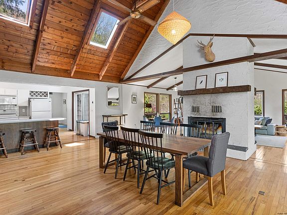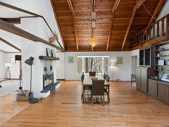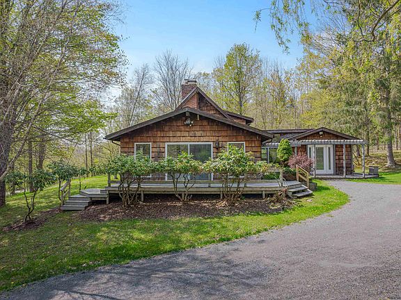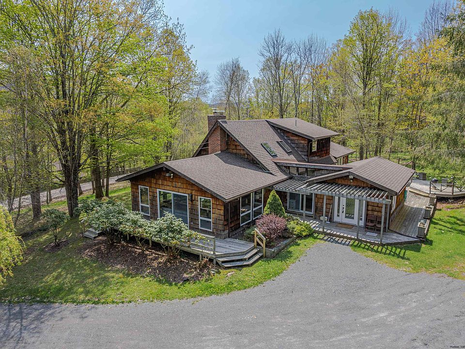 Anyone who has spent time in the Catskills Mountains can certainly understand its appeal--fresh air, picturesque views, easy access to skiing, hiking, and other outdoor activities. Come and see this modernized Catskills contemporary home privately sited on 1.5 acres with seasonal mountain views and mid-century details throughout. The property is situated on a quiet, dead-end road and offers 3 bedrooms and 3 baths with almost 3000 square feet of living space. A welcoming entryway flows effortlessly into the expansive mid-century kitchen with breakfast bar and dining area. The open concept living space also features a great room with cathedral ceilings and a stunning, double-sided wood-burning fireplace. Surrounded by windows, the main level is flooded with natural light. The primary suite with ample closet space for storage has direct access to the outdoors. Walk through the french doors to dine al fresco under a canopy of mature trees on the abundant outdoor deck. Another bedroom, full bathroom with tub and laundry room complete the main level. Upstairs, you will find an additional guest suite with a full bathroom. The property features wilderness woods, clean lines and bright spaces perfect for entertaining. An oversized 2-car garage is ready for your workshop space and offers plenty of storage for kayaks, bikes and cars. Significant capital improvements have already been made and include a new roof on the home and garage, new NYC DEP-approved septic system, perimeter drainage and upgraded driveway. Located in a bucolic setting for ultimate peace and relaxation, yet accessible to both Belleayre and Plattekill Ski Resorts, restaurants, shops, farmer’s markets, hiking, biking and exploring popular nearby hot spots. Membership option to the Roxbury Run Country Club with its beautiful pool and tennis courts is transferrable. Opportunity awaits with this unique income-producing property. For a completely turn-key option, the furnishings are also available.