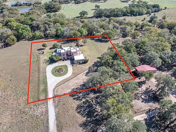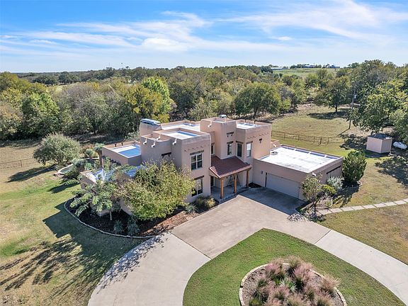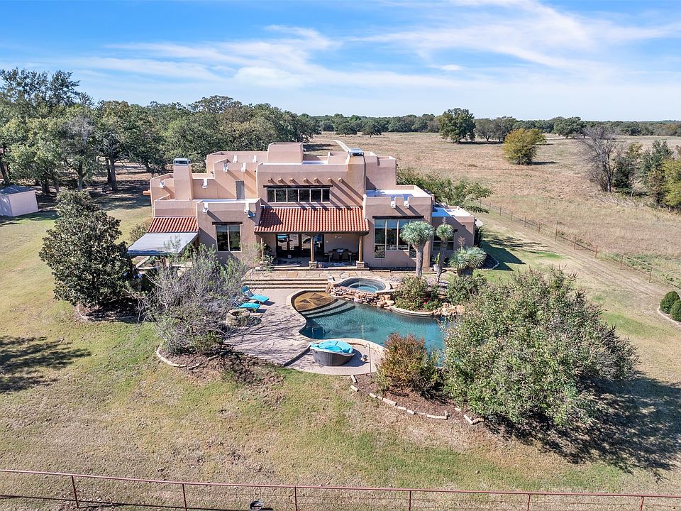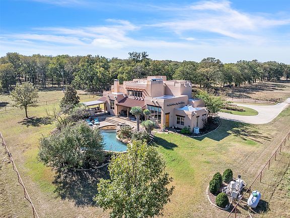 This exceptional custom Santa Fe-style home in Decatur, Texas, offers unparalleled privacy and luxurious amenities on 2 pristine fenced acres. This property combines seclusion with your closest neighbors a half a mile away with the convenience of being just 10 minutes from shopping and local attractions. Outdoors, relax in your private oasis featuring a resort-like backyard complete with lush landscaping, a sparkling pool and spa, waterfall, and an outdoor kitchen outfitted with a Big Green Egg, gas grill, ice maker, drink cooler, and kegerator. Step inside, and you’re greeted by the soaring 20-foot ceilings in the great room, paired with a fireplace and floor-to-ceiling windows, creating a striking entry. Unique design elements, including stained concrete floors, lend warmth and character throughout. The kitchen is a chef’s delight, featuring a gas stove, double ovens, a high-end refrigerator, and a generously sized island, ideal for entertaining. Adjacent to the kitchen, a cozy eat-in breakfast area offers serene views of the surrounding landscape. There's also a wet bar and an elegant dining room anchored by a two-way wood-burning fireplace, perfect for intimate gatherings. The spacious primary suite is a luxurious haven, complete with his-and-hers closets, dual sinks, and a personal vanity. The home also offers a library, media room, and additional bedrooms, each with its own en-suite bath. The finished basement includes a safe room or gun room behind a secure metal door, adding an extra layer of peace of mind. This property is a rare find, a perfect blend of tranquility and luxury. You must see this one-of-a-kind property in person!