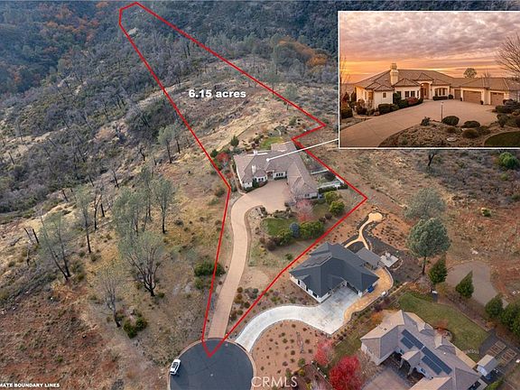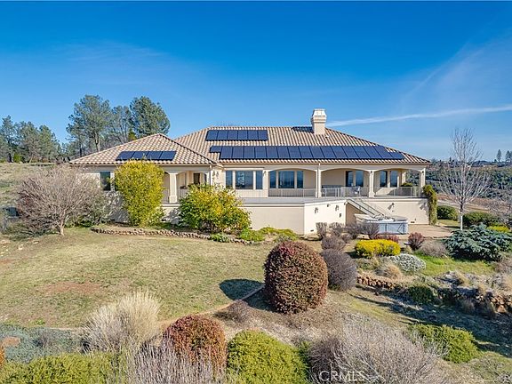 Welcome to Paradise! This breathtaking custom Mediterranean estate, built in 2008, is nestled at the end of a gated cul-de-sac, offering unparalleled million-dollar views of historic Honey Run Road, Skyway, Butte Creek Canyon, the Valley floor, and the stunning Coastal Range. Spanning 4,763 sq. ft. on 6.15 acres, this grand residence features 4-5 bedrooms, 3.5 bathrooms, a 4 car garage with an EV charging station, and owned solar. Inside, the home showcases a dramatic entryway, soaring ceilings, and exquisite wood beam accents in the family room. The family room is a showstopper, boasting a floor-to-ceiling rock fireplace and panoramic views through expansive windows. The gourmet kitchen is a true entertainer’s dream, featuring two oversized islands with granite countertops, custom cherry cabinetry, stainless steel appliances, a spacious walk-in pantry and a large breakfast nook. A formal dining room, formal living room with a fireplace, and custom office (or optional fifth bedroom) add to the home’s functionality. Adjacent to the kitchen, you’ll find a convenient bathroom and a bedroom featuring outdoor access and a spacious walk-in closet. Down the hall, two additional bedrooms each boast their own walk-in closets and share a well-appointed Jack and Jill bathroom. The luxurious primary suite is tucked away in a private wing, offering dual walk-in closets, a spa-like bathroom with a soaking tub and walk-in shower, plus a hidden closet. Step onto the expansive composite deck directly from the primary suite or kitchen, where you’ll find a built-in outdoor kitchen, ample seating/entertaining area, automatic window shades, and misters for warm summer days. The backyard is fenced, has electrical ran for a hot tub, and offers plenty of space for a pool. Don’t miss this rare opportunity to own a one-of-a-kind retreat with breathtaking views!