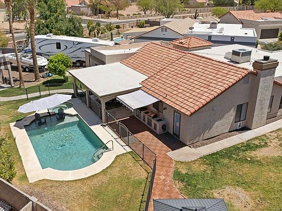 Discover your dream Chandler, Arizona home with RV parking and a private guest casita! This single-story beauty offers no HOA, a PebbleTec pool, motorized RV gate, and full RV hookups with septic & power. The casita includes a kitchen, laundry, bed/bath, living area & private yard—perfect for multi-generational living or Airbnb rental income. Main home features 4 bedrooms, 2 baths, 3-car garage, wood floors, granite kitchen with island, gas range, double convection ovens, walk-in pantry, R/O & soft water system. Enjoy a front courtyard, outdoor kitchen, and large yard for gardening or recreation. Move-in ready in a prime Chandler location! COMBINED SQ FT IS 2901- 2325 MAIN HOME + 576 CASITA! Casita 2019, Motorized Rear Entry RV GATE 2018, Roof 2021, Electric Water Heater 2023, New Window Front room 2025, Back Sliders 2015, Kitchen Door 2015, AC 5 Ton Trane 2021, Inground Back sprinklers, 2023, Pool Pump 2023, Outdoor Kitchen 2024. Electric Fireplace in Casita. Casita has Split AC Unit & dedicated Water Heater. RV HOOKUP WITH SEPTIC,POWER AND CAN UTILIZE CASITA FOR WATER.