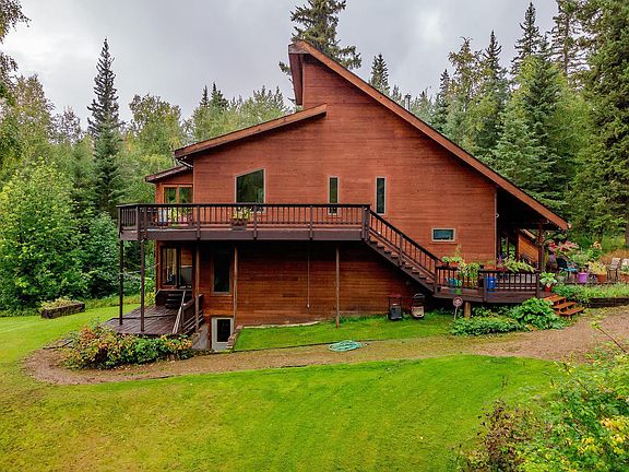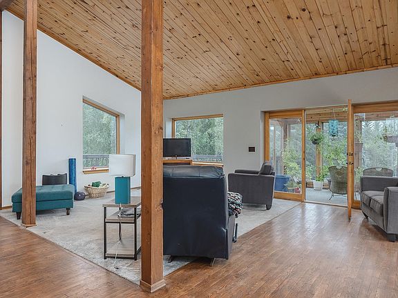 Beautiful and spacious custom home located in the picturesque Goldstream Valley/Murphy Dome area and boasts an impressive 5 bedrooms, 3 bathrooms, and detached 2-car garage. With over 2,800 square feet of living space, and a notable 7.9 acres with mountain views, this home features tons of character, lots of natural light, and energy efficiency. Featuring a large kitchen with tile floors, a sizable island for eating and food prep, and tons of cabinetry for all your storage needs. The main living space features impressive, vaulted ceilings finished with tongue and groove, hardwood floors, large windows, and access to a sunroom. The spacious master suite features a huge walk-in closet, full bath, hot tub accessed through French doors, and lots of windows bringing in natural light with remarkable views. This level also includes two additional bedrooms. Downstairs you will find a den, two additional bedrooms, and a ¾ bath as well as a conveniently located mechanical room. Enjoy the summer months on the upper or lower decks overlooking your manicured lawn. Also featured on the property is a large greenhouse/workshop where you can grow your garden while also having a personal workspace for your hobbies. With triple-pane windows, double-wall construction, and a wood stove to offset fuel costs, this home has all the space, efficiency, and privacy you could ever need while still being a short commute to all of town’s amenities.