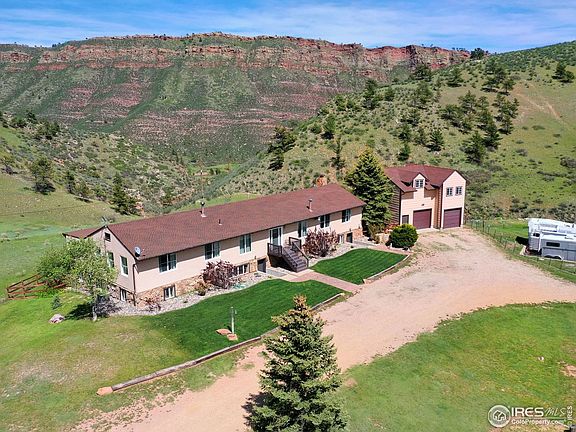 Quiet and private low-mountain living near Lyons and Longmont on this 20-acre lot with a 7-bedroom house in multiple units. It sits on a level area of the property overlooking intriguing cliffs and a ravine that change hue by the hour, providing a constant natural kaleidoscope. A two-car double story garage provides apace for cars and a shop. A 25 x 50' metal pole barn lies below the house. It needs some TLC but is a useful structure. Call agent for further details.