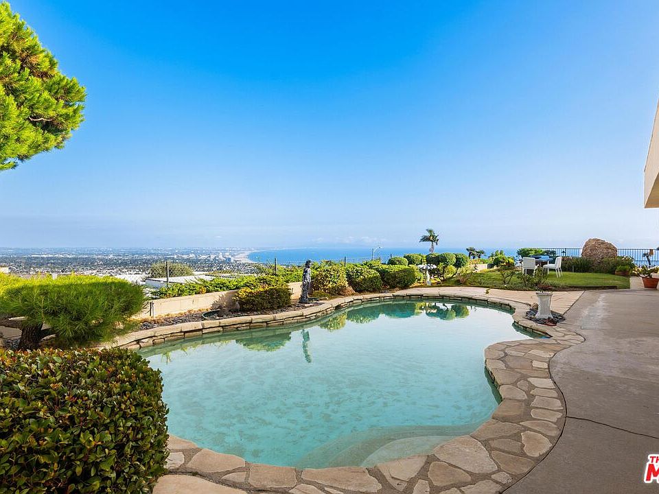 Enjoy 270-degree views of Downtown Los Angeles, The Queen's Necklace, The Santa Monica Pier, Catalina Island, and beyond! This is a rare chance to renovate or build your dream home on the highly sought-after Charmel Lane in the Marquez Knolls neighborhood of Pacific Palisades. The home is set back behind gates, behind a deep driveway that offers both privacy and security. Upon entering this serene single-story home, you'll be captivated by the sweeping, unobstructed panoramic views. The spacious great room features a cozy fireplace, living areas, and a dining space, while the large kitchen boasts a center island and a breakfast nook with stunning views of the swimming pool, ocean, and cityscape. The primary suite offers breathtaking ocean and city views, a private bath, dressing area, and a walk-in closet. Three additional guest bedrooms, two full bathrooms, and a powder room complete the living space. Step outside to the backyard, where a blend of entertainment areas, a swimming pool and spa, and a lush grassy yard provide the perfect setting for enjoying the best of outdoor LA living, all with incredible views. The property sits on a 14,799-square-foot lot, presenting an excellent opportunity for expansion, customization, or new construction.
