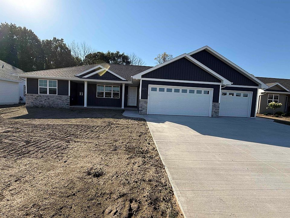 Beautiful brand new 1,619sf ranch in the Village of Howard on a .29ac wooded lot! Enjoy a lrg covered front porch w/porch posts. Open concept split bdrm design w/3 beds & 2 full baths. A nice-sized LR w/gas fireplace leads into kitchen & dinette, all w/cathedral ceilings. Kitchen features lrg walk-in pantry, island w/snack counter, & SS dishwasher & microwave. Mudroom w/benches & hooks. Master bdrm features step tray ceiling, private full bath w/double sinks, walk-in shower, & lrg walk-in closet w/access to 1st-floor lndry room which features a folding counter. Full bsmt w/egress & stubbed for a future bath. Attached 3-stall grg w/bsmt access. Exterior features vinyl siding & stone per plan. Virtual staging in photos.