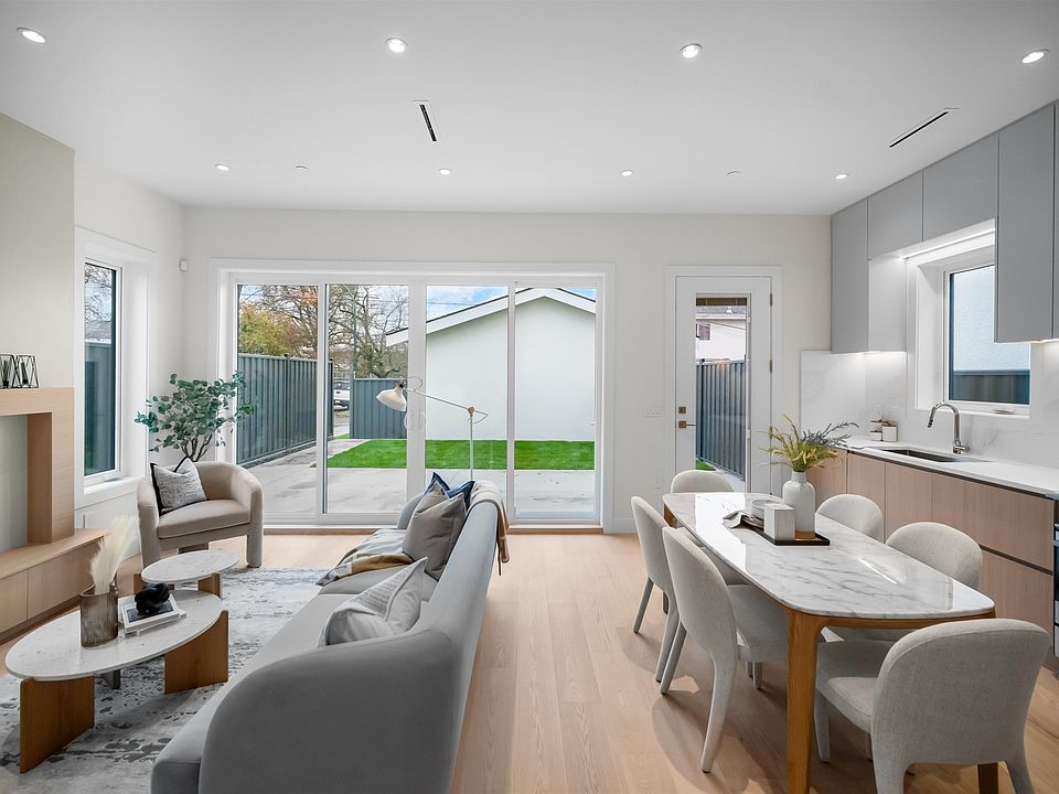 Experience unparalleled luxury in this brand-new corner 1/2 duplex in coveted Kensington/Cedar Cottage, completed in collaboration with a highly esteemed interior/exterior expert. Wrapped in natural tones with refined exterior stonework, this home features 3 bdrms each with a spa-inspired ensuite plus 3.5 baths and a sophisticated open layout. Highlights include Fisher & Paykel appliances, quartz countertops, custom cabinetry, hardwood floors, radiant heat, A/C heat pump, HRV and a fireplace. LED ambient lighting enhances key spaces. Approx 23' x 11' cemented patio and fully fenced yard extend outdoor living. Top-floor sanctuary boasts soaring ceilings and a private balcony with breathtaking downtown Vancouver views. A detached EV-ready garage completes this impeccably crafted residence.