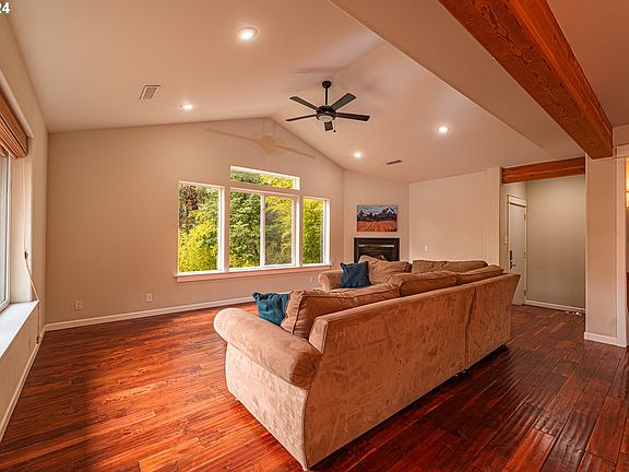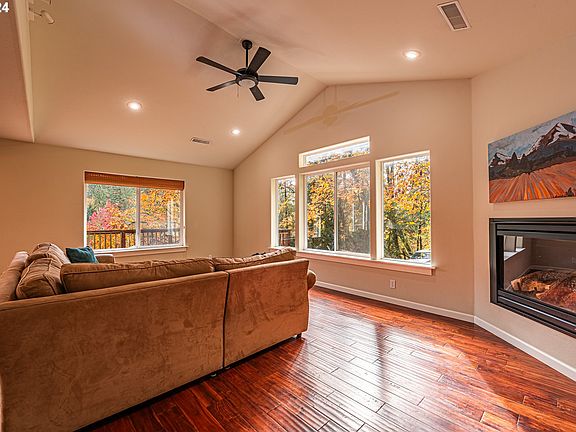 Rare newer home in SE Eugene. This 3-bedroom, 4-bath home offers spacious living with expansive picture windows that fill the space with natural lighting. Breathtaking views from all levels. Vaulted ceilings and wood beams add charm and character. Chef's kitchen features two sinks and gas range. Real wood floors. Bottom level tile floor is heated. Primary bedroom with walk-in closet, huge jetted soaking tub, slate and glass shower, marble counter, and double sinks. High-end finishes throughout.