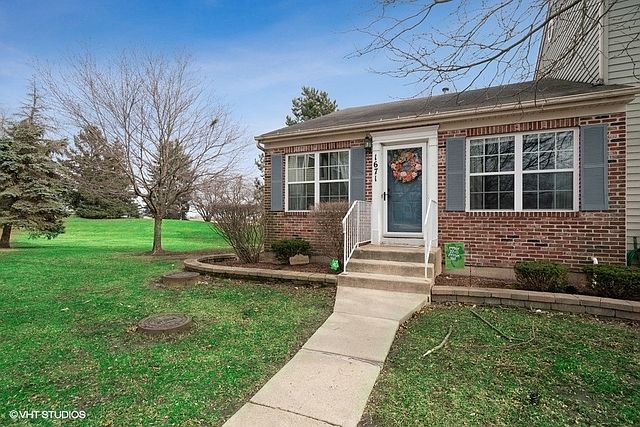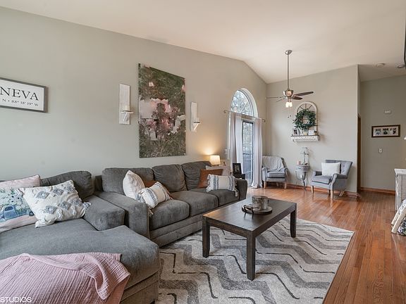 Absolutely perfect, cute, and updated end unit ranch townhome on a very quiet Geneva block! Nothing to do but move in. Bright, clean and neutral throughout - offering ship lap, hardwood floors on main level, newer stainless appliances, kitchen backsplash and all new windows. Much more spacious inside that it looks from the outside. Vaulted ceilings offered in the sun-drenched dining/living room - ideal for a perfect entertaining space. Master bedroom has a walk-in closet. Plenty of storage in kitchen with taller cabinets and quartz countertops. Finished basement adds large entertaining space, 3rd bedroom, a full bathroom with a whirlpool tub and utility room with extra laundry and storage. Sip coffee on your oversized private deck with very large grassy view perfect for outdoor games. Please Don't forget to see the garage parking. Great community with many amenities including pool, Geneva splash park, and clubhouse. Sunrise Park and Prairie Path are also just steps away. Highly ranked Geneva School District. Convenient to downtown Geneva, Metra access, and shopping.