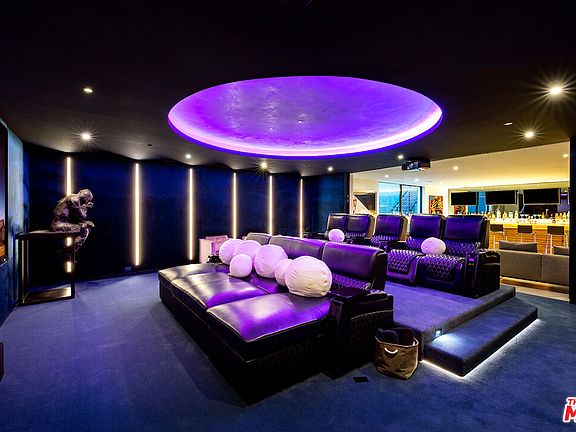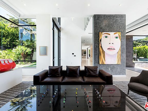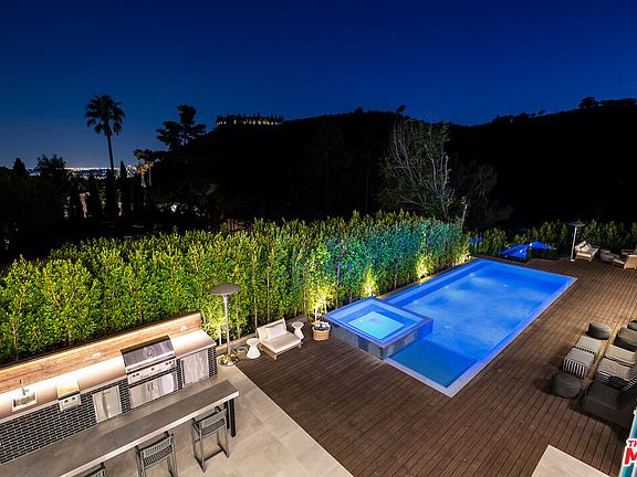 Contemporary private estate boasting impeccable interiors, breathtaking canyon views, city lights, an elevator, and an extraordinary 7-car showroom garage. Nestled in a serene locale free from through traffic, featuring ample street parking for guests, and mere minutes from the Beverly Hills Hotel. The master suite offers a private living area or study, a dual-sided bath with marble shower and soaking tub, remarkable his/her walk-in closets, and a secluded outdoor deck for al fresco movie nights or games. Upstairs, two additional exquisite suites feature multiple spacious decks and an office/library area. Downstairs, find two more suites and a lower level with a grand screening room leading to a sports and party room complete with a bar. Abundant storage, including an 800+ bottle wine cellar, and a private guest entry ensure seamless hospitality. Enjoy resort-style living with a stunning large swimming pool, full outdoor barbecue kitchen with pizza oven, expansive deck areas, and wrap-around yard space for children and pets. A truly exceptional family retreat, replete with every luxury imaginable.