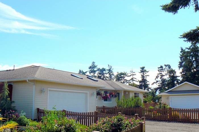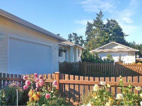 Custom 3 bdrm, 3 ba with panoramic view of the Olympic mountains and peek-A-boo of saltwater. 2 master suites on each end of the home are separated by an open great room and kitchen. Tiled entry, bath rooms and laundry room.maple wood floors in entry, dining and kitchen.Maple cabinetry with pull outs in kitchen, sink in laundry rm. Gas log fireplace, rear deck with trex . Attached 2 car garage and 2 detached. property is fenced with cross fencing. Extensive irrigated landscaping fence. more.