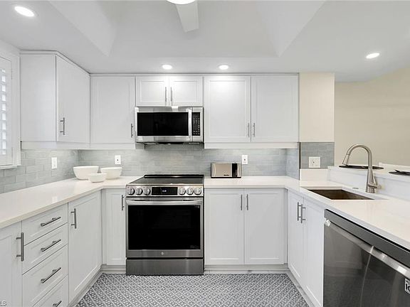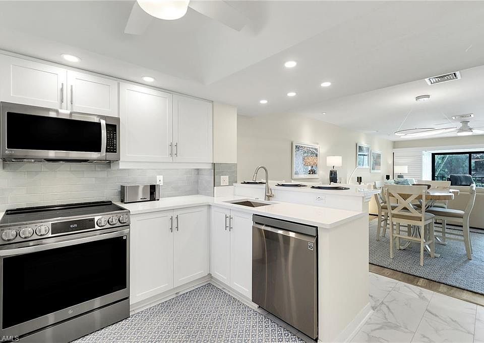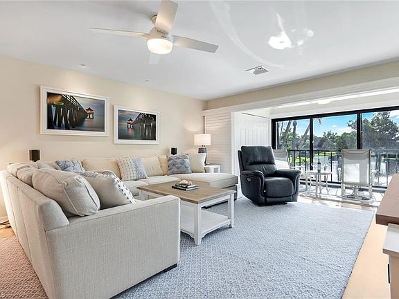 The absolute perfect Naples getaway home tucked away in a tropical oasis near the city and white sand beaches can be your very own! This completely renovated 2 bedroom, 2 bath condo showcases modern luxury and thoughtful design. Every corner of this unit is utilized for efficiency and offers storage galore! New Roof and updated community pool just steps away create an ease not unlike your own personal resort. This home offers a move-in-ready opportunity for the buyer seeking elegance and convenience. This home is a standout, sold turnkey furnished including high end TV’s, state of the art sound system, top quality finishes and furnishings that are fresh and coastal. Kitchen is bright, and white, with stainless appliances, and quartz counters. Designer lighting and fans throughout, fantastic local artist’s works on walls, all curated into a palette of crisp whites and blues, make this unit unique, and special indeed. Additionally, your private enclosed lanai offers a direct view of a shimmering lake and fountain that floods the home with morning light that must be seen to appreciate! Come see this slice of paradise today!