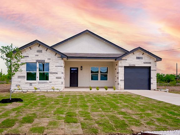 Offering ALL CLOSING COSTS PAID!! Welcome to 16720 Llano Estacado in Atascosa, Texas-a brand new, single-story stunner where modern farmhouse meets serene country charm. Perched on a spacious half-acre lot, this 4-bedroom, 2-bath home makes a bold first impression with its white and gray stone exterior, black trim accents, and matching raised garden beds. Accent exterior lighting sets the tone, while the oversized front covered patio with an extended slab creates a warm, inviting entrance. Step inside and feel the openness. You're greeted by a wide entryway and soaring 9-foot ceilings that lead into an airy, light-filled living space. Walls of windows on both sides-one in the dining area and one in the living room-flood the home with natural sunlight. Throughout the home, grey wood-look tile flooring adds durability. The striking kitchen is anchored by a large marble island that doubles as a breakfast bar for three. Sleek black globe pendant lights make an impressive statement above, while white cabinetry, stainless steel Frigidaire appliances, and a clean white tile backsplash tie everything together. A walk-in pantry keeps the space organized and clutter-free. Adjacent to the kitchen, the dining room brings extra flair with a bold black candlelight chandelier. The 17-by-16 living room is the heart of the home, effortlessly blending elegance and comfort. Recessed lighting and a modern black ceiling fan with remote complete the look. Tucked in its own private corner, the primary suite offers a true retreat. A soft glow from recessed lights and a Galea candlelight chandelier sets the mood, while a custom barn door leads into a spa-like bath. Inside, you'll find separate vanities, his and hers closets, and a walk-in shower wrapped in bold black tile with mosaic flooring and a built-in niche. Three additional bedrooms, each generously sized, sit in their own wing of the home. All feature spacious closets and modern farmhouse chandeliers. A shared soaking room offers style and function with a sleek black fixture, oversized vanity, and a tub-shower combo framed by rich black tile. Out back, a large covered patio with recessed lighting offers the perfect spot to relax, entertain, or dream up future backyard plans. With no HOA, 16720 Llano Estacado blends thoughtful design, modern finishes, and country tranquility-all in one move-in-ready package.
