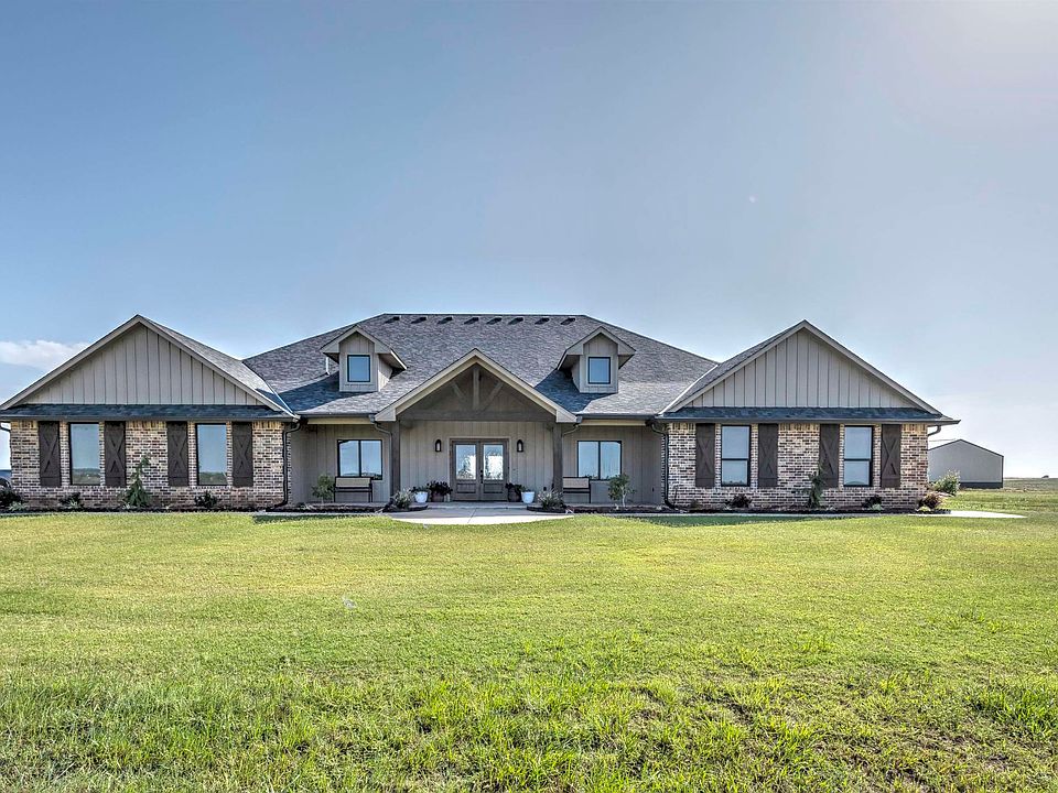 Custom-Built Beauty with Shop – Less Than 2 Years Old! Step into this stunning 3,454 sq ft 4-bedroom, 3.5-bath custom home, where thoughtful design meets luxury living. From the moment you walk in, you’ll be captivated by rich knotty alder doors and ceiling beams, brick accents, and high-end finishes throughout. The open floor plan centers around a gas log fireplace, perfect for cozy gatherings, with a spacious living area that flows seamlessly into the gourmet kitchen. The chef’s kitchen features a 5-burner gas cooktop, double ovens, a massive 12-person quartz breakfast bar, and an incredible hidden walk-in pantry. An office with custom built-ins offers the perfect work-from-home setup, while custom lighting and unique shiplap details add charm and character. Covered patio with outdoor kitchen. Two bedrooms are connected by a Jack-and-Jill bath, ideal for families or guests. The spacious primary suite includes spa-like features, and don’t miss the safe room located in the garage for added peace of mind. Instant hot water adds convenience, and every inch of this home reflects quality craftsmanship. Outside, you'll find a massive 60x90 shop with a 30x90 awning and four oversized overhead doors—a rare find offering space for projects, storage, or hobbies. This property is situated around 76 acres and is located midway between Duncan and Lawton, Ok. This is more than a home—it’s a lifestyle. Don’t miss your chance to own this exceptional property!
