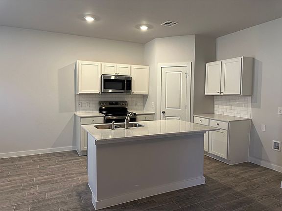 The Hartford floor plan features stylish wood-look tile flooring throughout, creating a warm and inviting atmosphere. The kitchen boasts White cabinets, stainless steel appliances, pantry and a tiled backsplash. The primary suite is complete with a walk-in closet, a double sink vanity and a tiled shower stall. Two additional bedrooms feature carpet and ceiling fans. Enjoy relaxing evenings on the back patio overlooking the wooded lot. Other features include sprinkler system, interior laundry room, fenced in backyard and 2-car garage. The community includes walking trails, basketball court, pavilions and fire pits. Now Open: Neighborhood Clubhouse, Community pool and Playground. Lawn Care Included, sodded front and side yard and within fenced in backyard area. Pets are case by case.