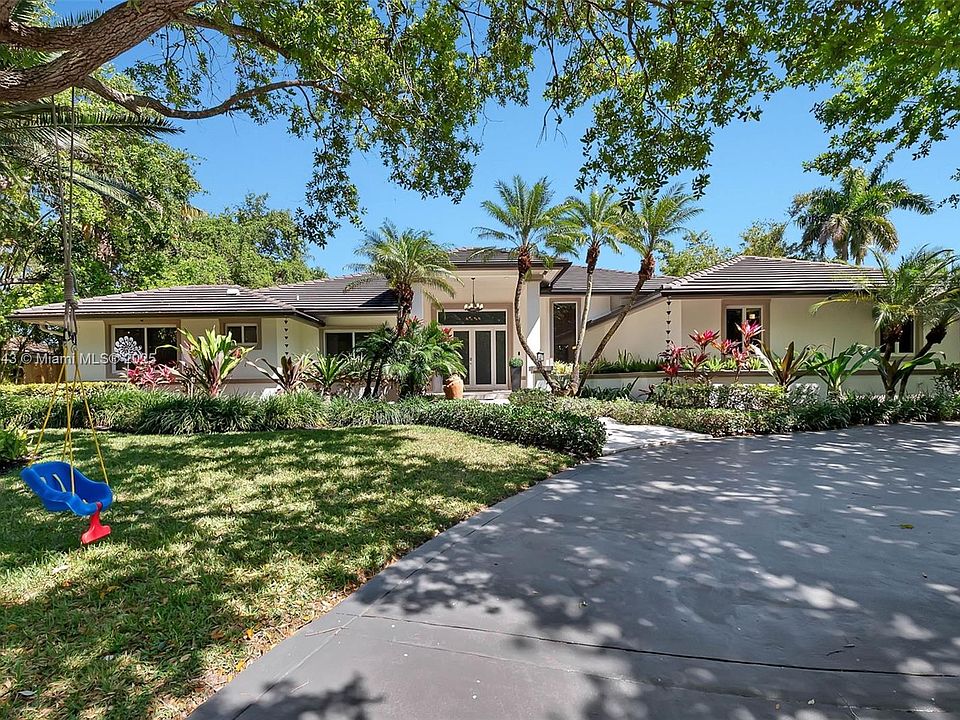 Spacious 5 bd/ 4 bath home on a wonderful tree-lined street in Palmetto Bay. Fabulous formal living & dining rms w/ volume ceilings. Impact windows. True chef’s kitchen w/ gas stove, double wall ovens, wine coolers, ice maker & oversized eat-in island, opens to family rm w/ fireplace. Marble & wood floors. Nicely sized guest bdrms, 1 bdrm & full bath separate, perfect for an office. Grand primary suite w/ walk-in closets, bath w/ dual sinks, vanity, jetted tub, water closet. Fenced yard w/ deep covered terrace, remodeled, heated saltwater pool & spa plus covered summer kitchen area. Beautifully manicured landscaping. New central vacuum, security system. Newer AC units, ductwork & insulation. Circular driveway & 2 car side entry garage. A quick golf cart ride to Starbucks, Deering Estate.