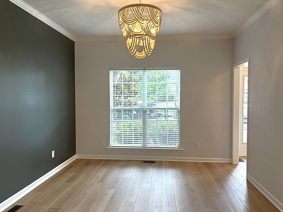 Available for immediate occupancy! 4 bedroom, 2.5 bath colonial brick home in sought-after Highgrove neighborhood. Covered entrance leads to foyer with coat closet, stairwell and wood flooring, with formal dining room to left and den to the right. Formal dining with decorative lighting and wainscotting with access to half bath and kitchen. Den on the other side of foyer can be used for many purposes, such as formal living room, foyer or children's play room; has decorative lighting, accent wall and double glass doors leading to the great room. The great room has a ceiling fan, chair rail, accent wall and fireplace, as well as plenty of natural light from bank of windows, and is open to the kitchen and breakfast nook. Spacious kitchen with stainless appliances, granite counters, tile backsplash, and breakfast bar at the breakfast nook, which has plenty of natural light and door to rear deck. Laundry room, garage and stairs to unfinished basement are off the kitchen. Upstairs primary bedroom with trey ceiling and fan. Large walk-in closet with plenty of storage space. Large en-suite bath with dual sink vanity and mirror, separate jetted tub and walk-in shower and water closet for privacy. 2nd, 3rd and 4th bedrooms with ceiling fans. 2nd bedroom has access to walk up stairs to the attic. Hall bathroom with dual sink vanity and tub/shower combo located between the bedrooms. Walk out unfinished basement has plenty of room for storage and doors leading to the backyard. Rear deck off breakfast nook with Sunsetter retractable awning for shade, overlooking large backyard.