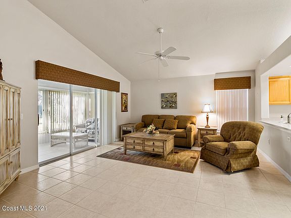 If it's a low-maintenance lifestyle in a premier 55+ community you're after, welcome home! This gated neighborhood offers the perfect balance between privacy & a close-knit community. Immaculately presented, the floor-plan boasts soaring ceilings, loads of natural light & an interior that flows effortlessly from the living space to the sunny, private, under-truss Florida room! The kitchen features wood cabinets, solid surface countertops, & offers open sightlines to the great room & Florida room; perfect for entertaining! The master suite is partnered with a large ensuite & huge walk-in closet. Private guest area includes generous size bedroom & immaculate guest bath. A flex room (bedroom/den) completes the home. Additional features include accordion shutters, NEW roof & gutters & NEW A/C! As a resident of this 55+ community you have access to lifestyle amenities including an elegant clubhouse with heated pool, hot tub, tennis/pickleball, bocce, gym, & library. Attend dinner dances, informal socials, concerts, yoga, water aerobics, art classes, book clubs, cards, billiards, lectures, & more! Nearby A+ shopping, dining, & quality medical facilities. One hour to Orlando attractions & minutes to beautiful beaches! HOA includes all lawn maintenance, irrigation, & exterior painting.