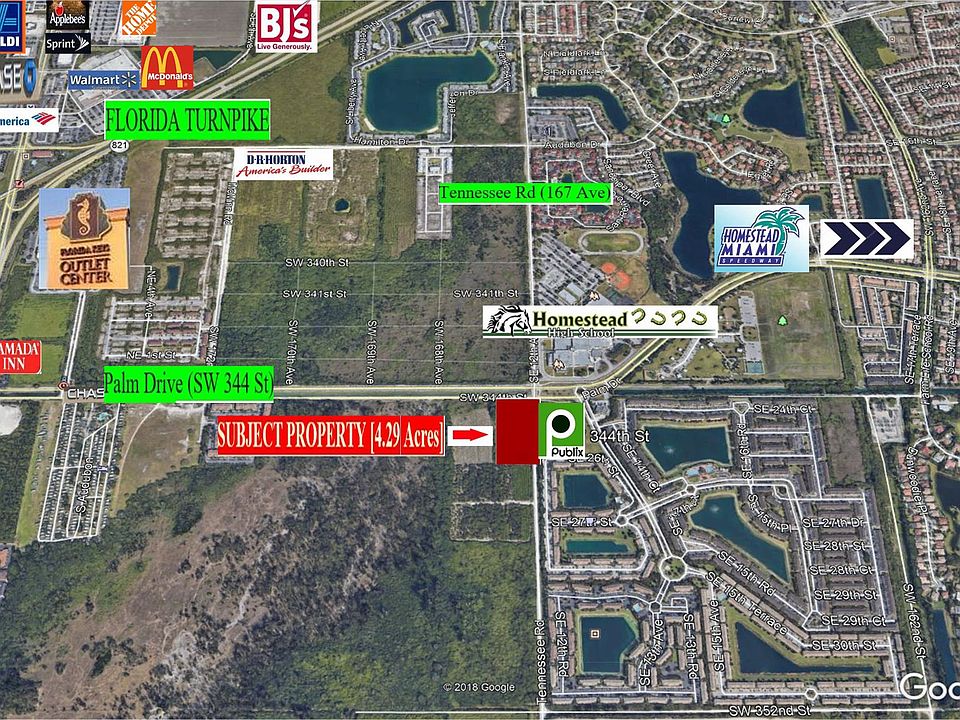 The property consists of 4.29 acres [186.872.4 sq. ft.] situated on the SW corner of SW 344th Street (Palm Drive) and 167th Avenue (Tennessee Rd.) in the city of Florida City in Miami-Dade County. The site is located just east of the US-1 exit from the Florida Turnpike near the Florida Keys Outlet Mall, Homestead-Miami Speedway, Walmart, Home-Depot, BJ's outlet mall, etc. Publix owns the parcel across the street to the east of the subject property