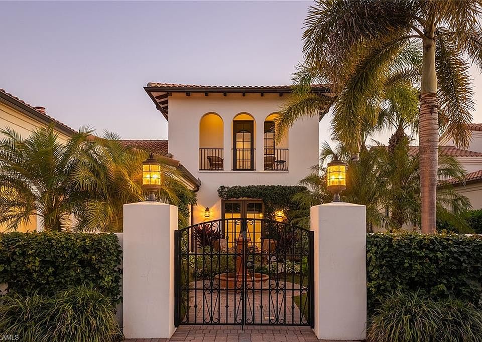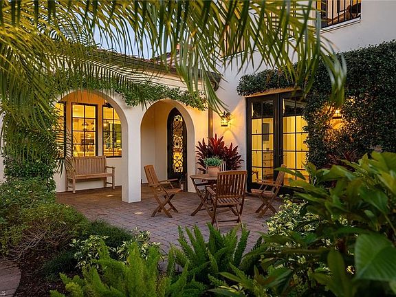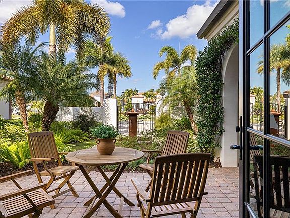 There’s a certain kind of home that does not shout, it simply welcomes. From the moment you enter the courtyard framed by flowering vines, a private entrance gate and a tranquil fountain—this Santa Barbara–inspired residence invites you to exhale. It lives like a private sanctuary: effortless, graceful and quietly luxurious. Inside, the design evokes California refinement. Wide-plank Silver Oak Vintage Barrel wood floors anchor the interiors, meeting distressed pecan cabinetry. Curated original artwork and natural textures add depth and dimension, while Spanish tiles appear tastefully in the kitchen, fireplace surround, staircase risers and baths. Professionally styled by Olivewood Interiors, with a palette that is both relaxed and elevated. Plumbing fixtures throughout are appointed in aged, oiled bronze offering a timeless appeal. The kitchen is equal parts elegant and functional, centered by a quartzite island while custom Omega cabinetry, top-tier appliances, gas cooking and a walk-in pantry with open shelving, generous counters and integrated drawers create a seamless culinary space. Beamed ceilings extend through the kitchen and into the great room, adding warmth and architectural continuity. The adjacent dining room is proportioned for both intimate and formal gatherings. In the great room, the fireplace anchors the space with understated sophistication. Adjacent, the bar includes full-height wine storage behind an iron gate and a built-in wine refrigerator—ideal for entertaining or everyday ritual. Take advantage of the office area featuring oversized windows and seamless connectivity to outdoor living areas. Privately situated with direct pool access, the primary suite offers tranquil lake views and spa-style finishes, creating a restful and refined retreat. Three guest suites offer ample comfort, each with thoughtful separation and en-suite accommodations. Upstairs, the versatile retreat opens to a balcony with long lake views—an ideal setting for use as a lounge or guest space. Blurring the line between indoor comfort and outdoor serenity, the saltwater pool is enveloped by the water vistas. Travertine tile from Italy was carefully selected for the lanai and pool deck, offering both texture and elegance underfoot. The covered outdoor living space features a tongue-and-groove ceiling and a fully equipped summer kitchen and retractable screens for year-round comfort. The relaxing pool area is enhanced by the sounds of a Spanish fountain and the ambient glow of a gas firepit—creating a tranquil setting for unhurried afternoons and sunset gatherings. Impact-rated windows and doors, remote-controlled screens and a whole-home Sonos system provide modern convenience as well as a water filtration and a power generator. In the award-winning community of Mediterra, with 36 holes of Tom Fazio golf, Har-Tru tennis, pickleball, bocce and a private beach club, along with a new Sports & Lifestyle Center coming soon to enhance wellness and connection!