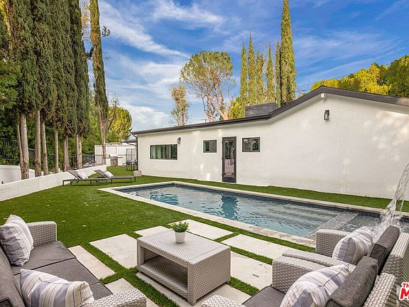 Perfectly situated south of the Boulevard in one of Encino's most desirable locations, this updated contemporary residence sits at the end of a long semi-private driveway, offering both privacy and sophistication. Step inside to discover soaring vaulted ceilings with skylights, a brick fireplace anchoring the dining room, and seamless flow into the chef's kitchen. The home features 3 spacious bedrooms, including two en-suite retreats, multiple living areas, and spa-inspired bathrooms. A versatile laundry room doubles as a potential pool house for added convenience. Recent upgrades include, HVAC, electrical, and pool systems, bringing peace of mind, all while being located in the acclaimed Lanai School District. Outside, an entertainer's paradise awaits; a sparkling pool and spa, oversized cabana, cozy fire pit, and an outdoor screening area, perfect for movie nights under the stars. Whether hosting friends or savoring quiet moments, this backyard delivers the ultimate Southern California lifestyle. All just moments from the best dining, shopping, and entertainment along vibrant Ventura Blvd.