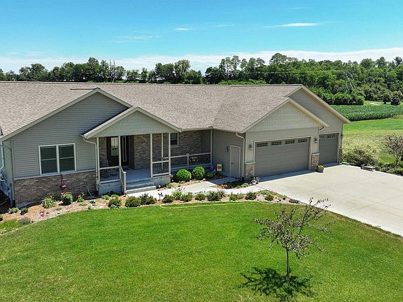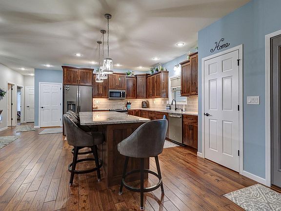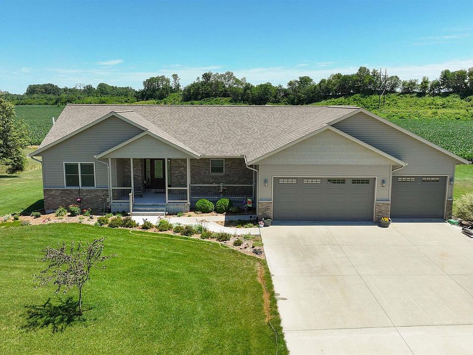 Dust off that pre approval letter, because your wait is over! This extremely well kept 4 bedroom, 3 bathroom dream home was built in 2017 and sits on 0.77 acres in the serene hunters ridge subdivision. Notable amenities include a community walking trail, high-quality craftsmanship, and the convenience of being just outside of town. This property boasts a spectacular sunset every night with country views you can enjoy from the covered patio, 3 season porch, or Trex deck! The open concept features a custom kitchen with alder wood cabinets, granite counter tops, and under cabinet lighting. Enjoy the ease of main floor laundry as well as secondary basement laundry option. The primary bedroom has a spacious en suite bathroom and walkin closet. The finished, walkout basement has a 4th bedroom, full bath, massive storage room and a second full kitchen as well. Other high end features include hand scraped hickory hardwood flooring, silverline windows, 11 zone sprinkler system, oversized and insulated 3 car garage with epoxy floors, as well as a lower level garage, perfect for the yard equipment. Seller is offering a 14-month Home Warranty valued at $495. Seller has had well, water, septic inspected 7/2 and all came back clean!