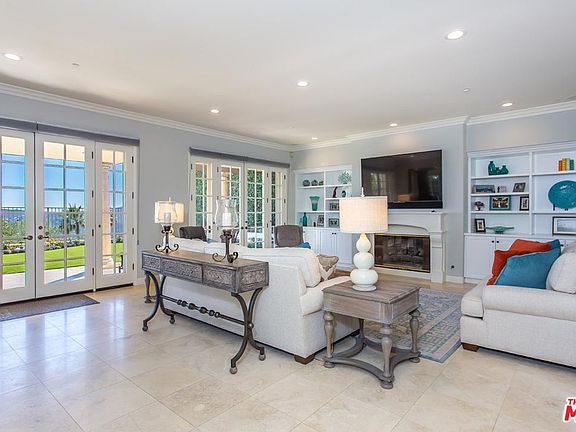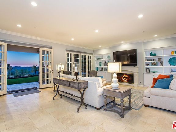 Imagine yourself in the hills above the Mediterranean as you gaze upon the blue Pacific & majestic mountain vistas from this impeccably upgraded villa on a private, guard gated street. The grand entry leads to beautiful stone floors, an elegant step-down living room with dramatic stone fireplace & 2 story ceiling. There is a formal dining room with fireplace & French doors opening to patio with fountain, large family room with fireplace, built-ins & French doors leading to grassy yard with outdoor kitchen & dining bar. Gourmet kitchen with large center island, breakfast room, top of the line appliances, beautifully finished cabinetry & granite counters. The downstairs also includes one bedroom & bath and large office with glass French doors. A graceful iron staircase leads to the grand upstairs offering 4 over-sized bedrooms, including an elegant Master suite with dual baths, office/gym/nursery, 2 large walk-in closets, double fireplace & veranda overlooking the ocean & mountains.