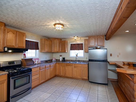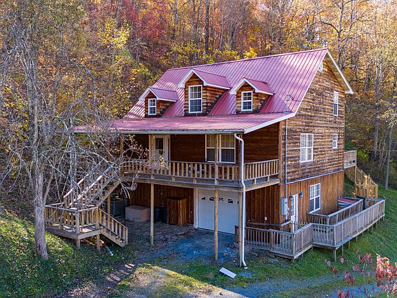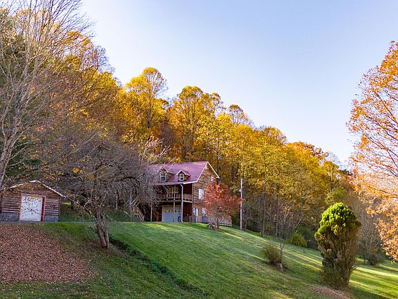 Attractive 3-bedroom, 2-bath log-sided contemporary home in tranquil 6-acre country setting. Full basement incorporating the garage, plus large matching outbuilding. Nestled on a wooded hillside in a yard filled with fruit trees and blackberry bushes, this rustic-style home blends seamlessly with its tranquil setting. Its features include an open plan living room/dining room/kitchen with a vaulted ceiling, upstairs and downstairs bedrooms and baths, plenty of storage space, and ready Interstate access to Lewisburg and Beckley. Located on a country road in the rolling farmland west of Lewisburg, the property enjoys an elevated view. A gravel driveway climbs to the home, which is sided with stained log veneer and has a metal roof. Stairs lead to the covered porch and front entry.