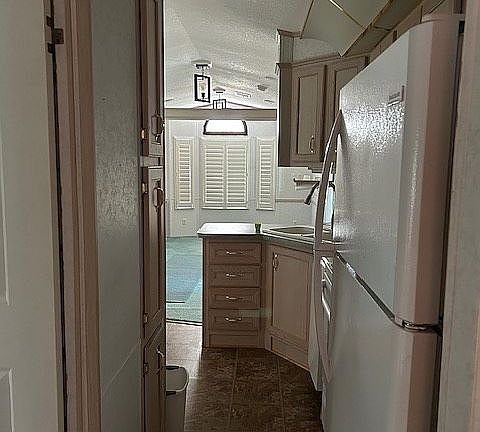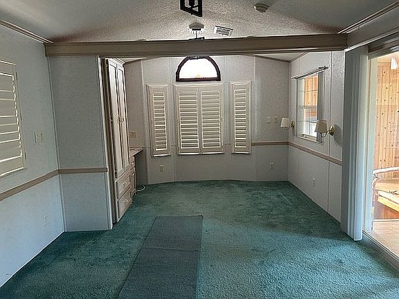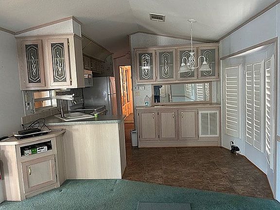 Spacious park model in gated Co-op, shareholder community with low HOA fee and lots of amenities! Three bed/2 bath with custom wood, hardwood steps, deck out back on lake side, large patio area at front door, parking for 3 vehicles, 2 driveways, large yard landscaped for privacy, plenty of outside entertainment area. Interior smooth flow, no step down to addition, all in excellent condition! New roof 2022, new concrete driveway 2022, hurricane slider and windows, new awning, newer AC. Front load washer/dryer, all kitchen appliances, plus new Bosc dishwasher. Shed for extra storage or workshop, more storage on concrete under this unit. Lake view has lovely sunsets and relaxing. A great bargain with lots more to see! Call to see this well maintained home!