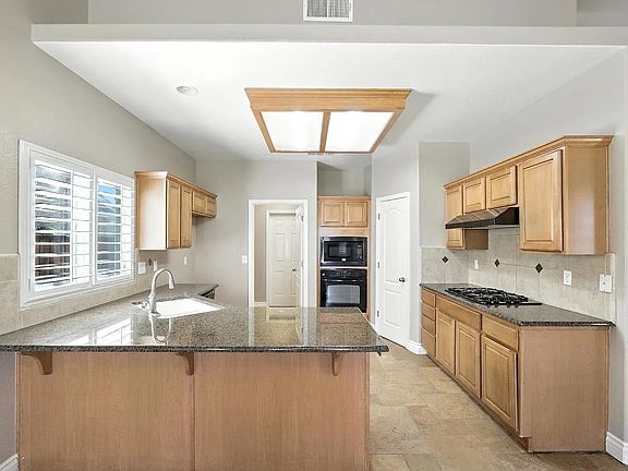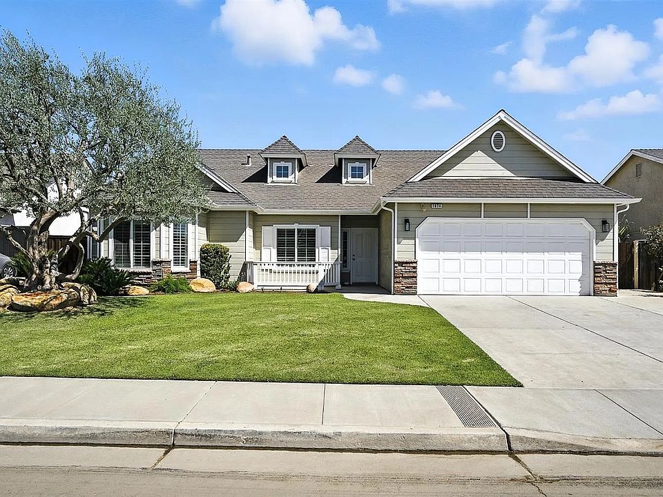 Beautifully designed 3-bed, 2-bath home in NW Hanford featuring vaulted ceilings, plantation shutters, and a cozy fireplace in the living room. The kitchen offers built-in appliances, a breakfast bar, nook, and pantry, with a dedicated laundry room. Guest bedrooms offer walk in closets, sharing a well-finished bath. The main bedroom offers custom built in wardrobe system with drawers and hanging units, and TV compartment, plus both a step-in and walk-in closet with built ins. The bathroom includes dual vanities, a soaking tub, and step-in shower. Outdoors, enjoy a large backyard with a covered patio, gazebo, play area with a play set, and privacy fencing.