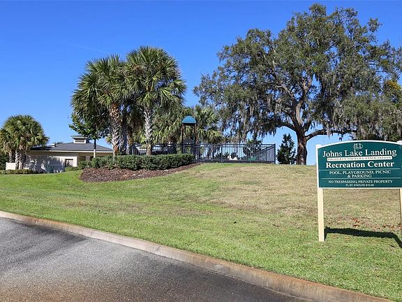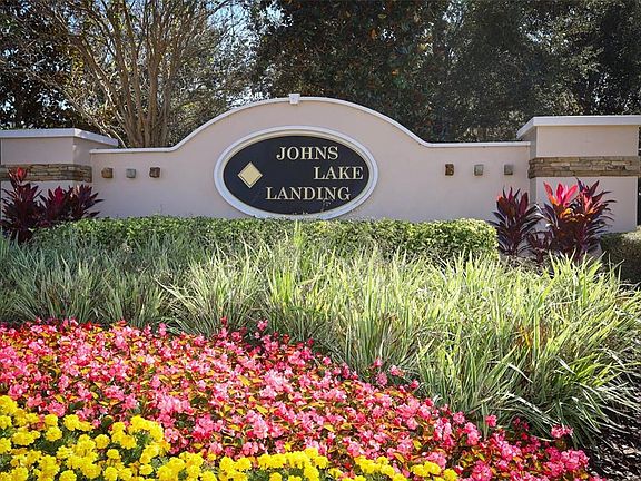 WELCOME HOME to this this beautifully maintained 3-bedroom, 2-bath home with enclosed Flex Space in the highly desirable community of Johns Lake Landing where lakes, rolling hills and green space takes you away from the concrete world as you head home. The home features an open space concept with the Great Room-Dining-Kitchen as one gathering area. The upscale kitchen features lots of 42" wood cabinets, upgraded SS appliances, stone counter tops with complementary backsplash and large island--Perfect for entertaining, food prepping, gathering, eating and homework! Dining area is an arm's stretch from kitchen with enhances the congeniality of the home. The wood paneled accent wall & barn door to bathroom enhances coziness & rustic feel...bathroom had double vanities, large walk-in shower, walk-in closet with build-ins. The frosted French door Flex space is off the Great Room--Ideal as a playroom, music room, reading or office. Two additional well appointed bedrooms and bath are spacious & each have a nice sized closet. Step out to the screened lanai for your enjoyment of the outside--step from paver floored screened lanai to open paver patio with built-in firepit. Enjoy the outdoors. Nice totally fenced in space for quiet time, for a garden, entertaining, play area....The home is ready for new owners,