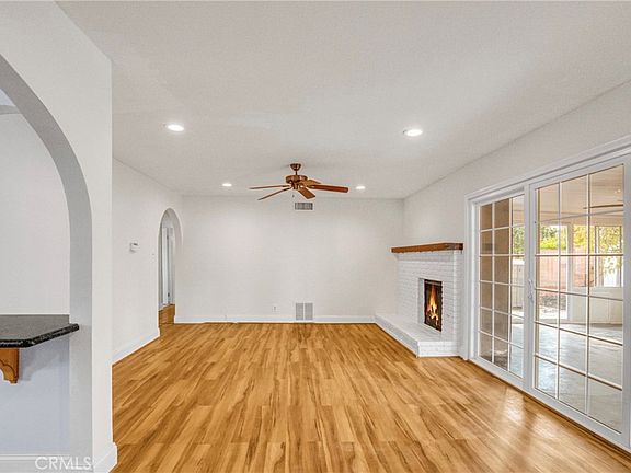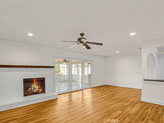 Step inside to discover a bright and airy open floor plan adorned with arched doorways, smooth ceilings, recessed lighting, and elegant crown molding. The living room exudes warmth and charm with its classic brick fireplace, ideal for cozy evenings. Dual-pane windows invite abundant natural light, while the **fully owned solar panels** promise energy efficiency and low utility costs. The kitchen is designed for everyday enjoyment and entertainment, featuring granite countertops, a stainless-steel sink, and ample cabinetry and countertops.