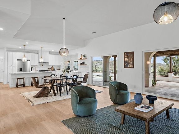 Dwell West Homes presents this rare opportunity to own a fully remodeled Mediterranean-inspired home on acres of picturesque, usable land in the heart of Fallbrook. This 4-bedroom, 3.5-bathroom single-level residence with 2 primary retreats boasts superior craftsmanship and luxury finishes throughout. A professional designer has curated a stunning space with new luxury vinyl flooring, fresh paint, and upgraded lighting throughout. The kitchen is a showstopper with slim white shaker cabinets, quartz countertops, a custom plaster range hood over a 36” freestanding gas range, floating shelves, a large island, and a matching outdoor bar counter. The spacious primary bedroom features a floor-to-ceiling tiled fireplace and en-suite spa-like bath with a His & Hers vanity, freestanding tub, and oversized tiled shower with a bench. Additional upgrades include a large laundry room with extra storage, new mirrored closet doors, and all-new GFCIs. The exterior features fresh landscaping with succulents, full exterior paint, new double-pane windows and sliders, a brand-new roof with a 5-year warranty, and a remote-entry gated driveway. The 4-car garage has new doors/motors including a new water heater. Conveniently located near Monserate Winery, Vineyard 1924, and Live Oak Park, this private retreat is truly one-of-a-kind. Don’t miss this extraordinary opportunity