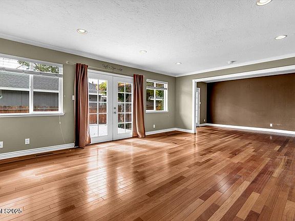 You will want to move right in; this home is ready to be lived in and loved The great room concept is highlighted with beautiful hardwood floors. There are 2 French doors, one set from the dining are and the other from the family/living area, leading to deck and wisteria covered pergola. The kitchen had a recent remodel with solid granite counter tops and stainless steel appliances. Under counter lighting and generous storage make this efficient kitchen easy to work in. The primary bedroom has a walk in closet, ceiling fan and the bath has been recently updated with 2 sinks and granite countertops. This 3 bedroom, single level home has a low maintenance front yard. The side has a viewing deck and patio. Lawn and room for a dog run on the other side. The back has a terraced area with space for planting what ever your heart desires.The yard holds an several; fruit trees. The 2 car garage allows space for storage. Located on a short cul de sac like street with plenty of privacy you are still able to quickly and easily reach UNR, downtown, shopping, dining and highway connections to anywhere in the valley. There is no HOA. Come take a look and see how comfortable and easy it will be to live in this compact and well designed home.