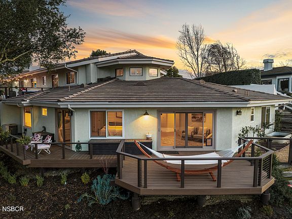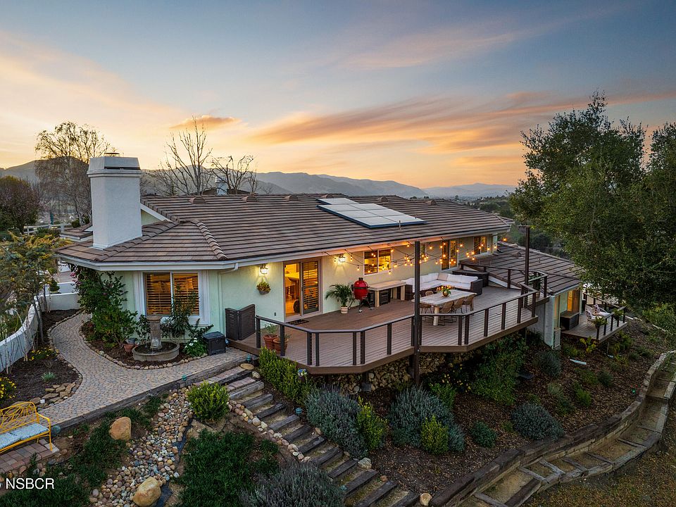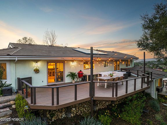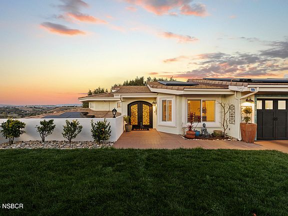 Experience the pinnacle of privacy and captivating panoramic views from this exceptional 3-bedroom, 2.5-bathroom residence, ideally situated atop Alisal Heights on a secluded 2.6-acre cul-de-sac. Surrounded by towering oak trees, meticulously landscaped grounds, and peaceful walking paths, this home offers the tranquility of a private resort, while remaining just moments from the lively charm of Solvang's downtown. The home's expansive open floor plan welcomes you through impressive iron rod double doors, leading to an elegant interior adorned with white oak flooring and custom iron railings. Whether hosting in the formal living room, gathering in the cozy fireside family room, or entertaining in the dining area, this newly remodeled space is designed for seamless connection. At the heart of the home lies a gourmet kitchen, showcasing custom wood cabinetry, a striking 10-foot quartzite island, and top-of-the-line appliances, including a 42'' Sub-Zero refrigerator, Bosch dishwasher, and Monogram ovens. The luxurious primary suite provides a spa-inspired retreat, featuring an oversized jet tub and a heated towel rack. Step outside to the expansive Trex decks--perfect for enjoying sunset views, al fresco dining, or stargazing. A detached studio with its own view deck offers an ideal space for guests or creative pursuits. With a 3-car garage, native landscaping, and solar panels for sustainable living, this residence harmoniously blends elegance and functionality.