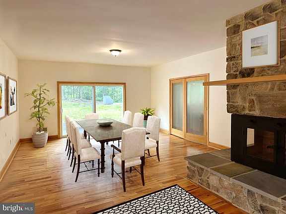 - Fireplace features: Glass Doors, Stone, Wood Burning