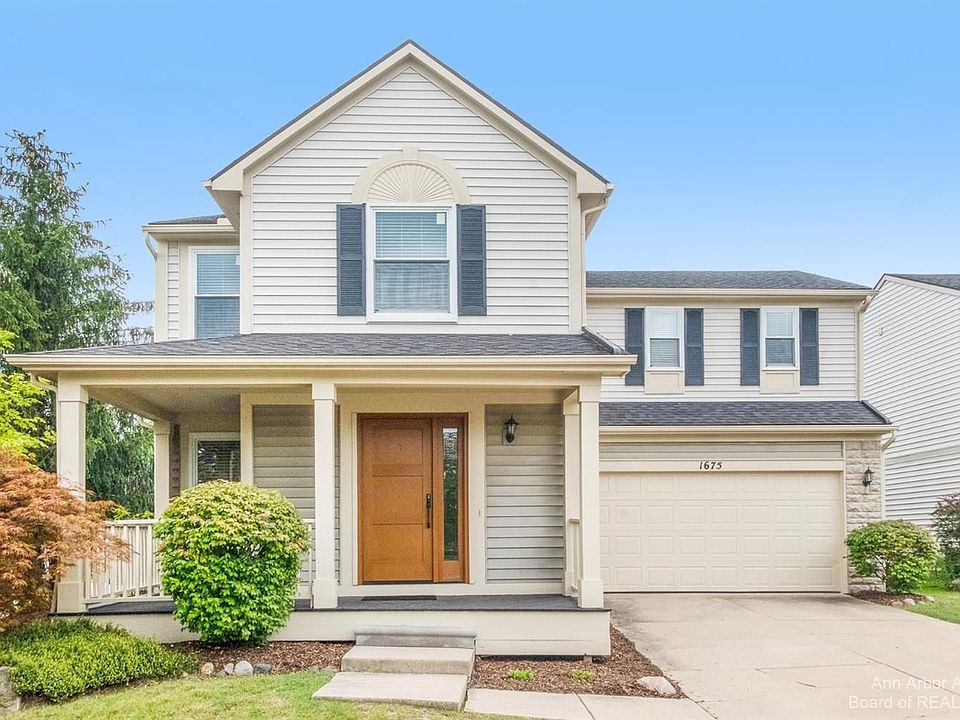 Don't miss this warm, welcoming 3-bedroom colonial in the popular Ravines neighborhood. Upon arrival, you will notice the immaculate landscaping, wrap around front porch, and brand-new craftsman style ThermaTru front door. Once inside, the inviting entryway leads directly to the living room with newer hardwood floors and vaulted ceilings, making the open concept cozy, yet spacious. The kitchen, highlighted by cherry cabinetry, stainless steel appliances, tile backsplash, & granite counters, is thoughtfully designed. Outdoor living accessed via the kitchen slider features a stamped concrete patio and large backyard, great for hosting family and friends. The basement is finished with a full bathroom and can be the bonus area you need for a family room, extra office, or workout space. The attached 2 car garage has ample storage with built-in cabinets. The owners have upgraded the HVAC (2018), Windows (2016), Roof (2011), and hot water heater. All the exterior wood trim was painted last year. Minutes from downtown Ann Arbor with easy access to freeways. This location offers low township taxes, Ann Arbor Public Schools, walking trails, and is across from a large park. Showings start Friday, 8/20, at 4:00.