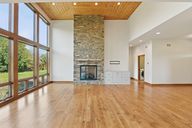 Floor-to-ceiling stone fireplaceCenter islandSolid oak floorsImpeccable landscapingKnotty pine ceilingExpansive west-facing windowsElegant primary suite